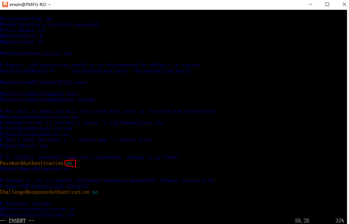 sudo vim /etc/ssh/sshd_configvim是Ubuntu的文本编辑器,相当于windows中的文本记事本一样,进入config文件后,找到下图 Figure 4 中所标的位置,键盘按 ii,进入编辑模式,修改即可;修改好之后按 EscEsc,再按::, 输入wqwq}(意味着保存文件修改并退出当前文档)
