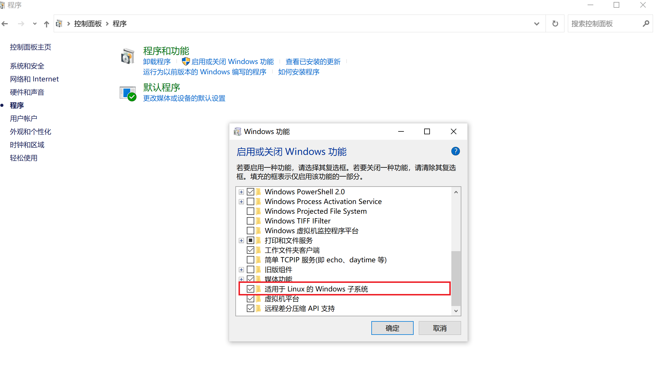 打开控制面板—-> 程序 —-> 启用或关闭Windows功能 —-> 适用于Linux的Windows子系统 和 虚拟机平台 (勾选)—-> 确定