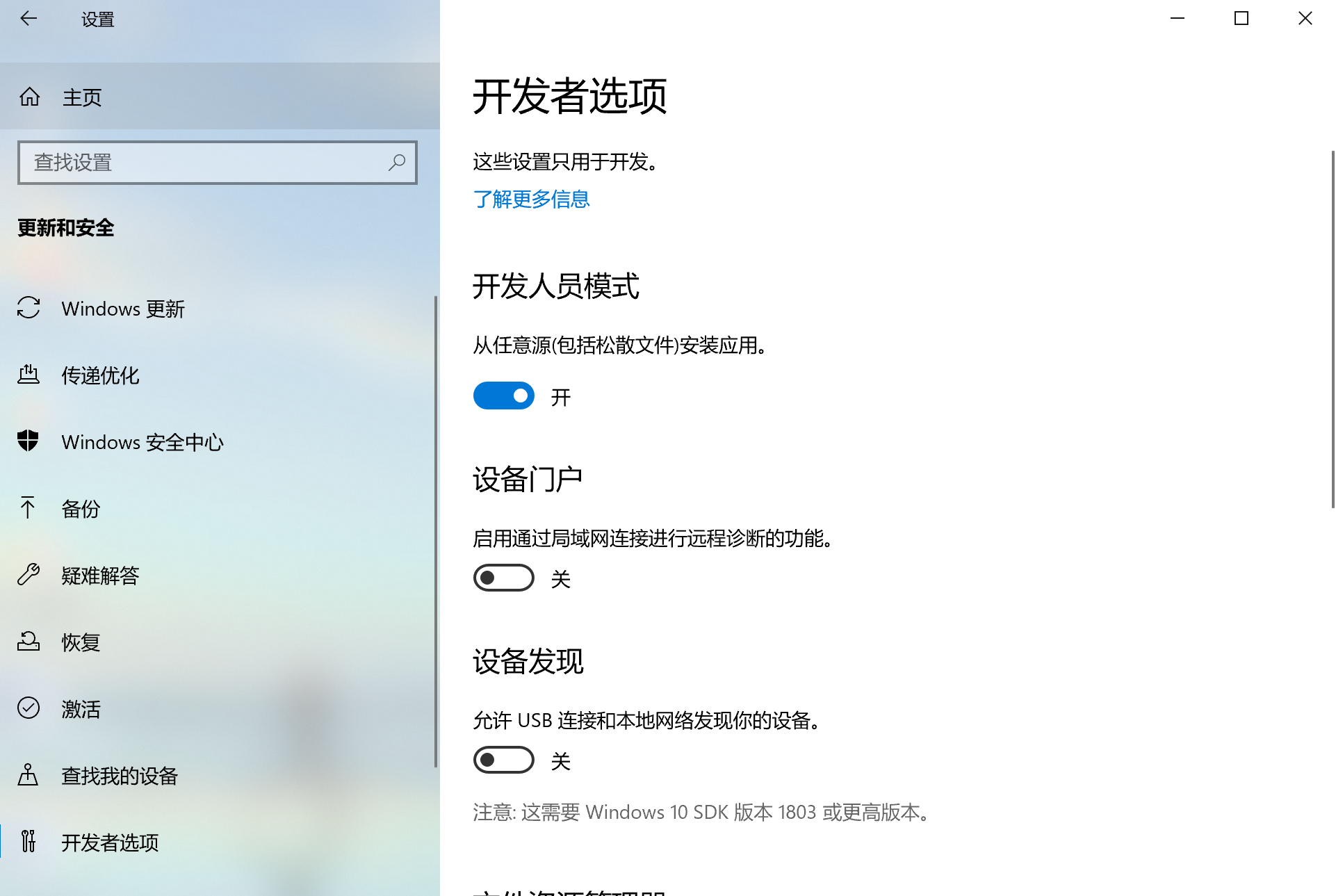 开发者模式开启:Windows开始键盘—-更新和安全—-开发者选项—-开发人员模式(开启)